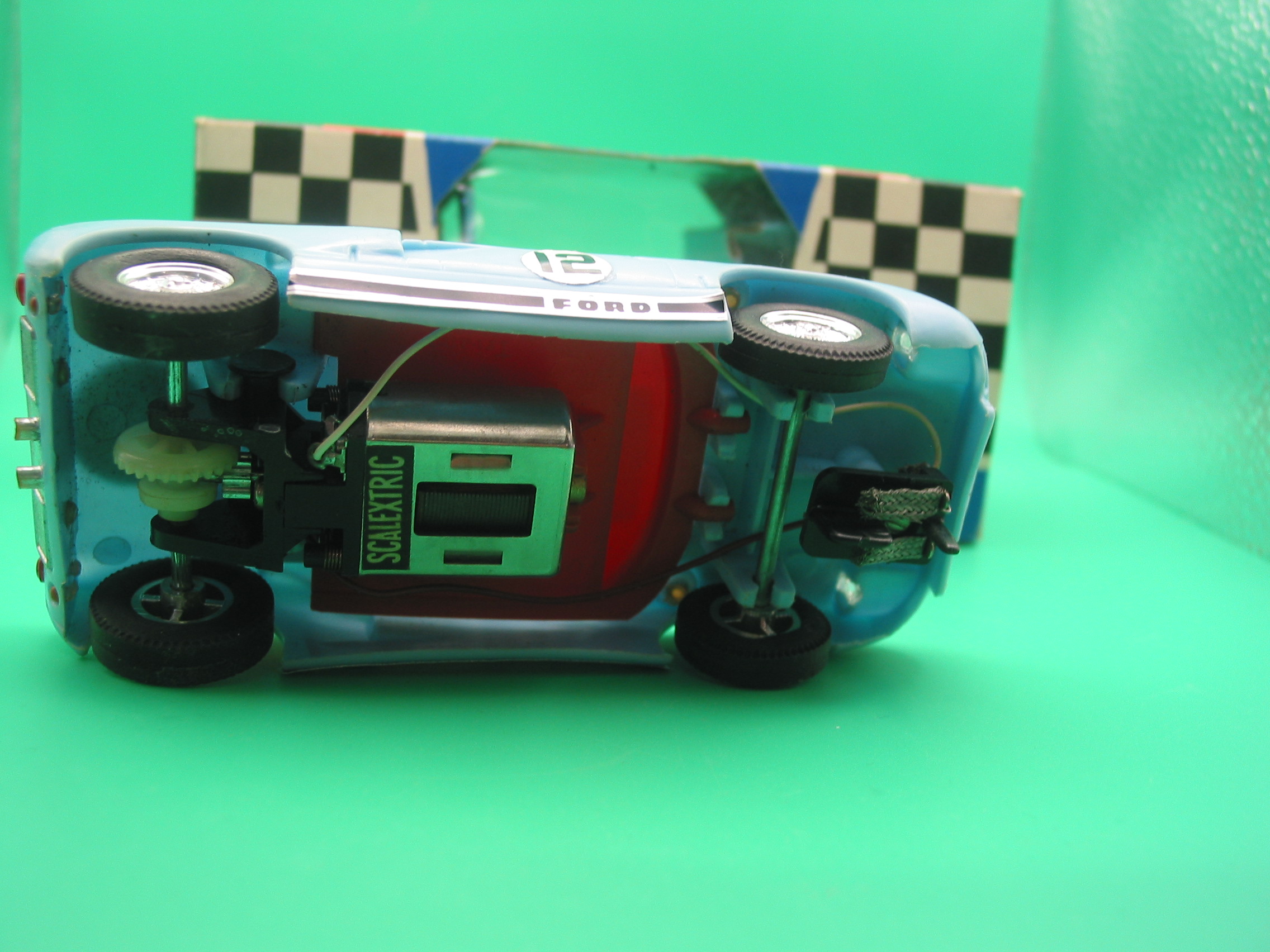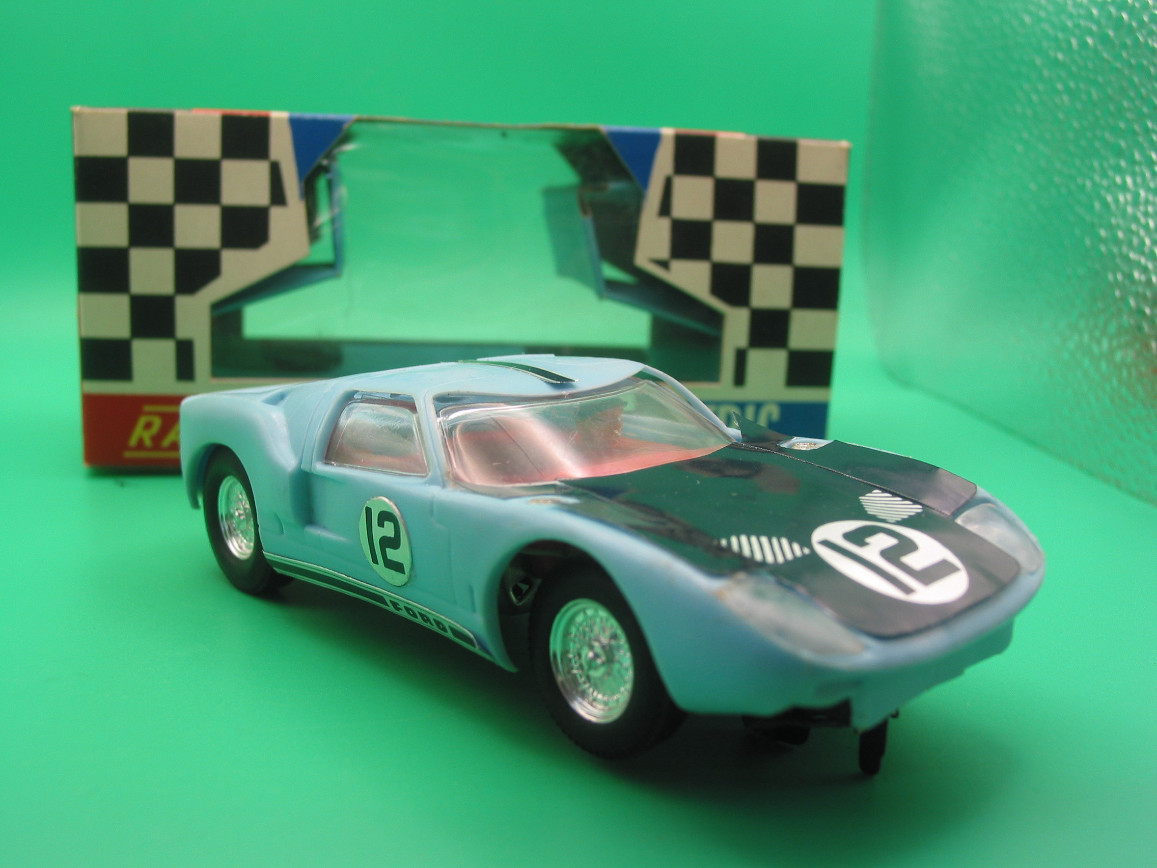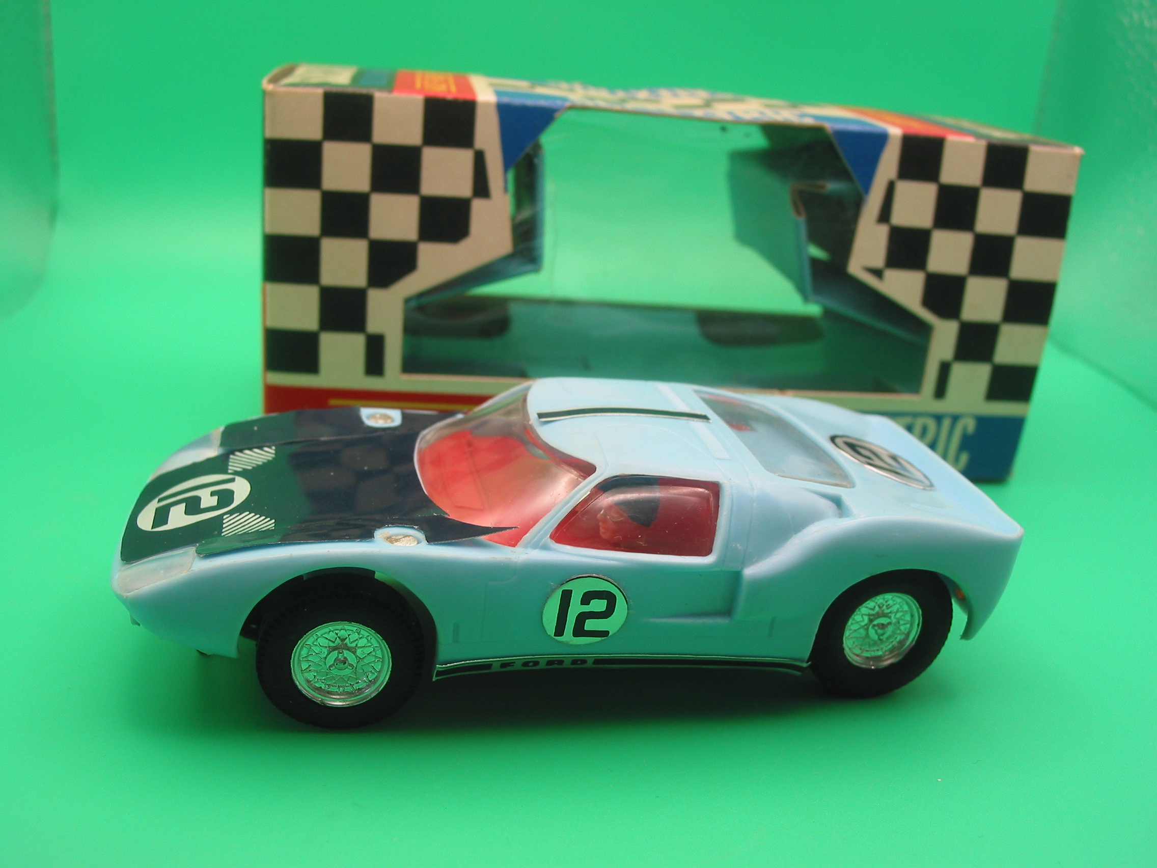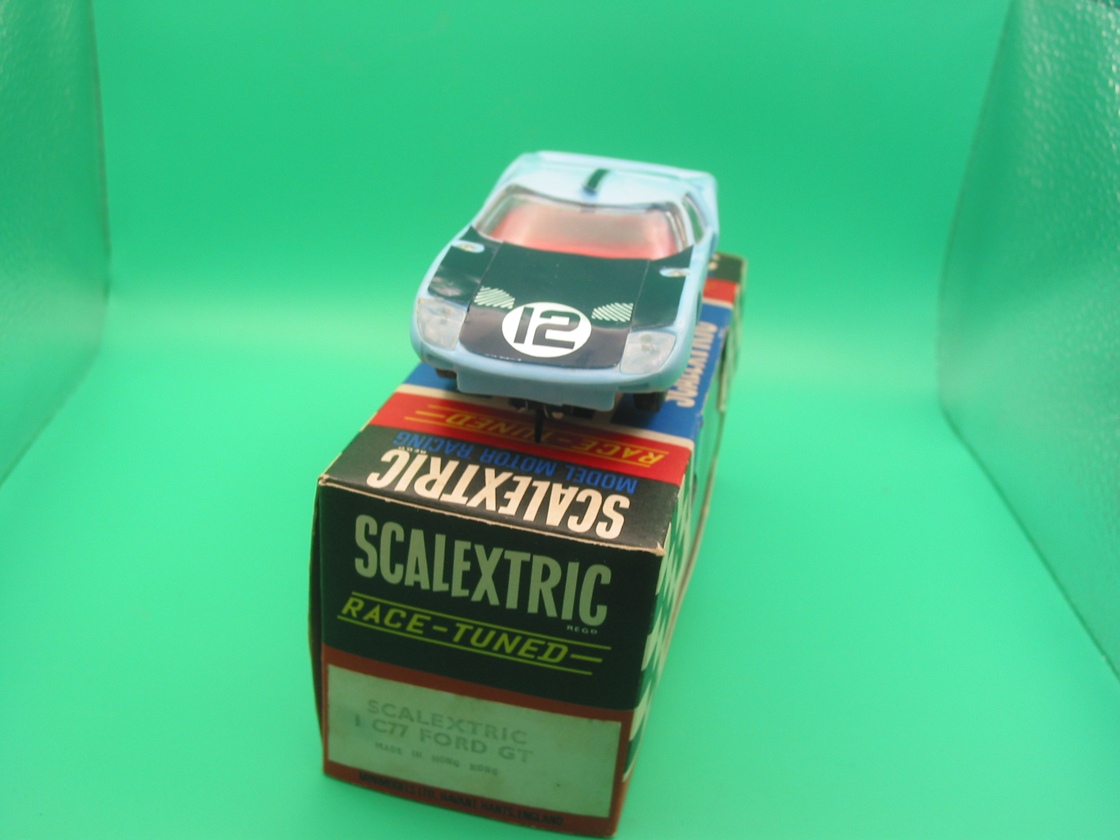 VINTAGE TRIANG SCALEXTRIC C77 FORD GT40 BLUE #12 RUNS WELL OUTSTANDING CONDITION WITH ORIGINAL BOX AND INSTRUCTIONS – ONE SLIGHT TEAR IN THE CELLOPHANE, NOT MANY RACE TUNED BOXES SURVIVE IN THIS CONDITION
